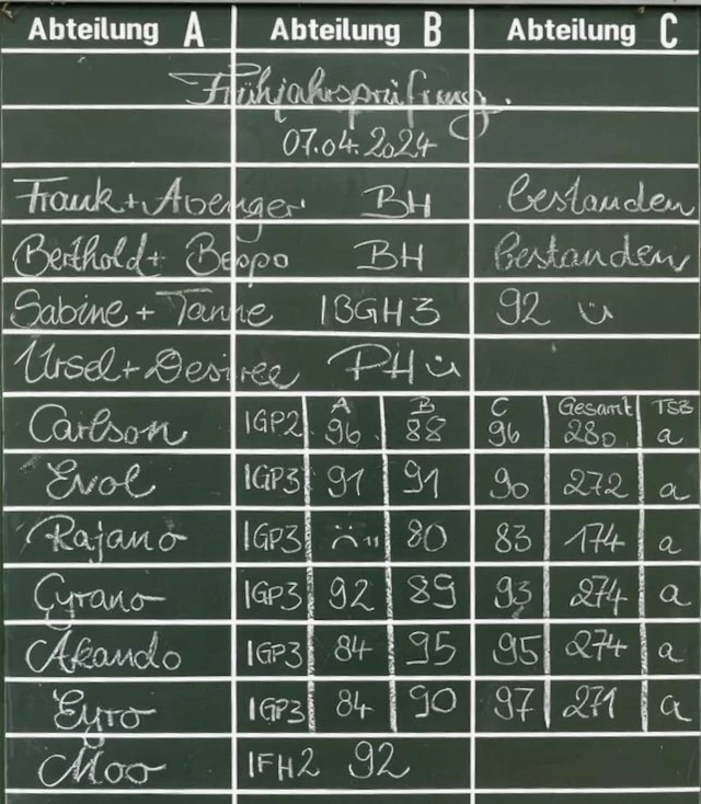 | Hund | Cyrano von der Maineiche | Rüde | Boxer | IGP3 | 92 | 89 | 93 | a | |